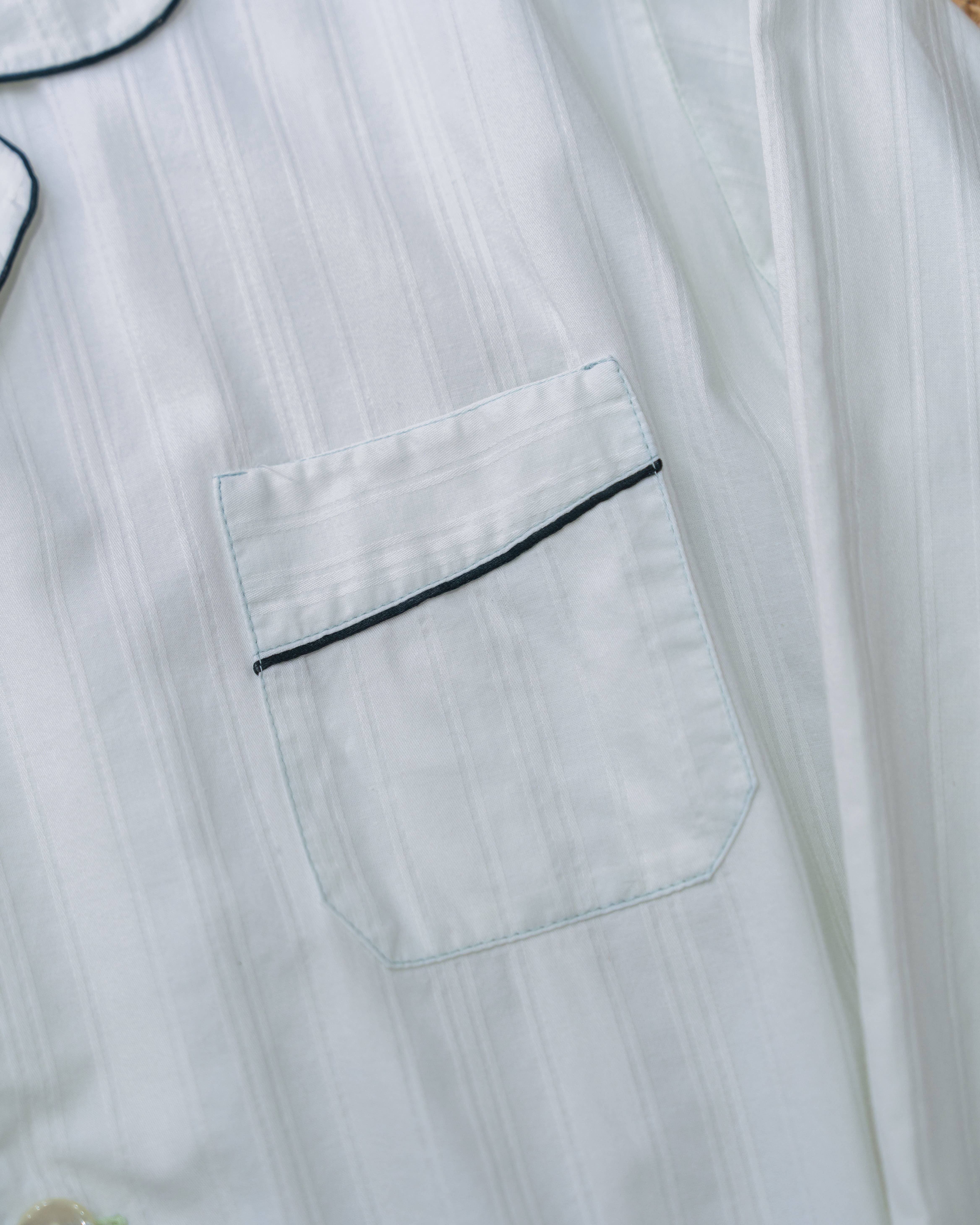 淡く緑味がかったホワイトのパジャマシャツ。襟とポケット、袖口に施された細いグリーンのパイピングが上品でクラシックな印象を与えます。