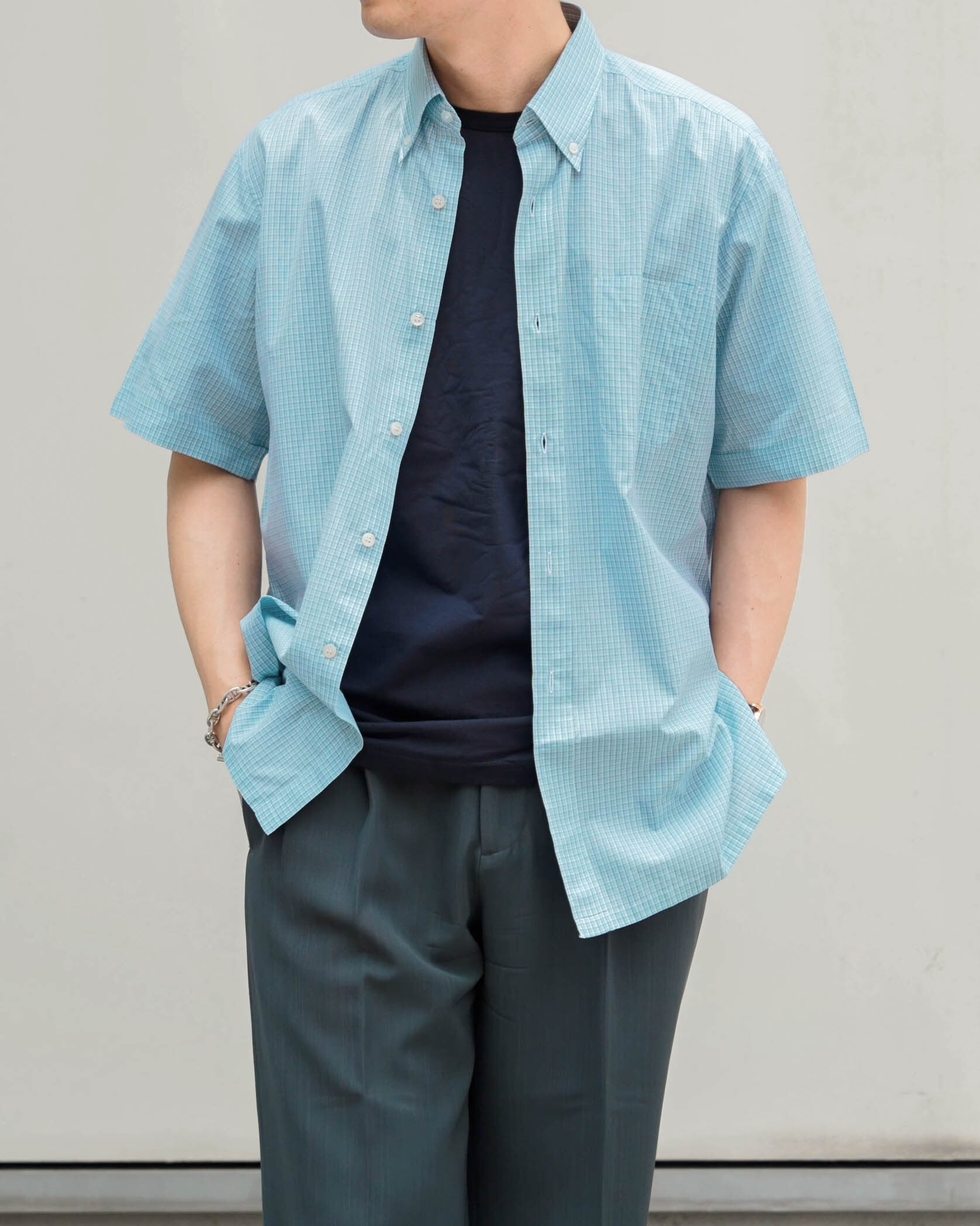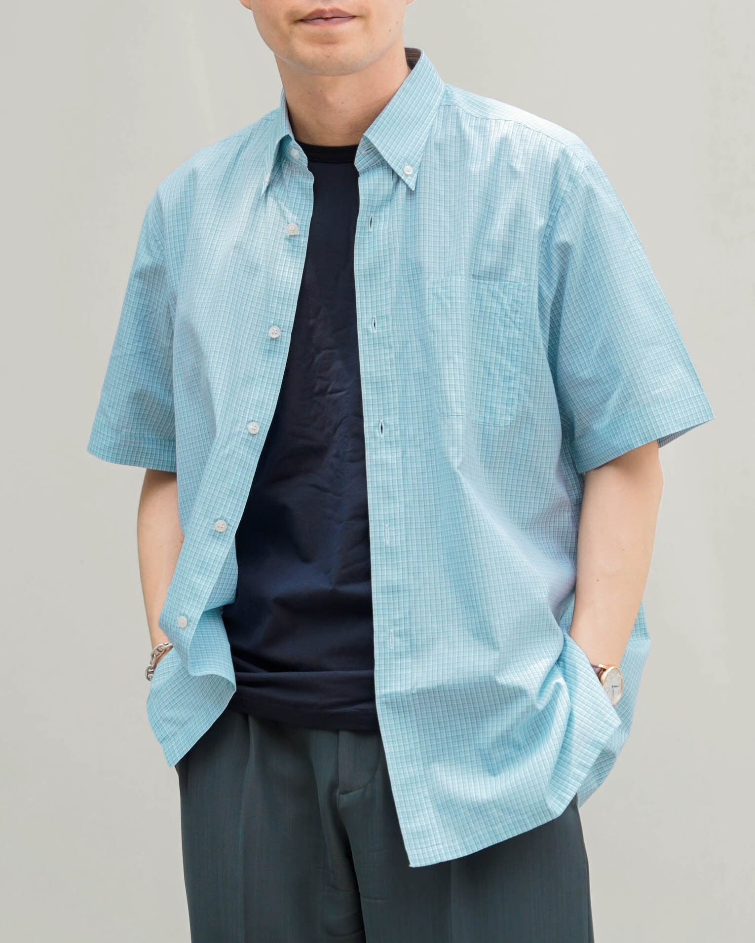 ターコイズグリーンのチェック柄が爽やかな印象。ボックス型のリラックスしたシルエットが魅力で、タックアウトしてもバランスよく着こなせます。