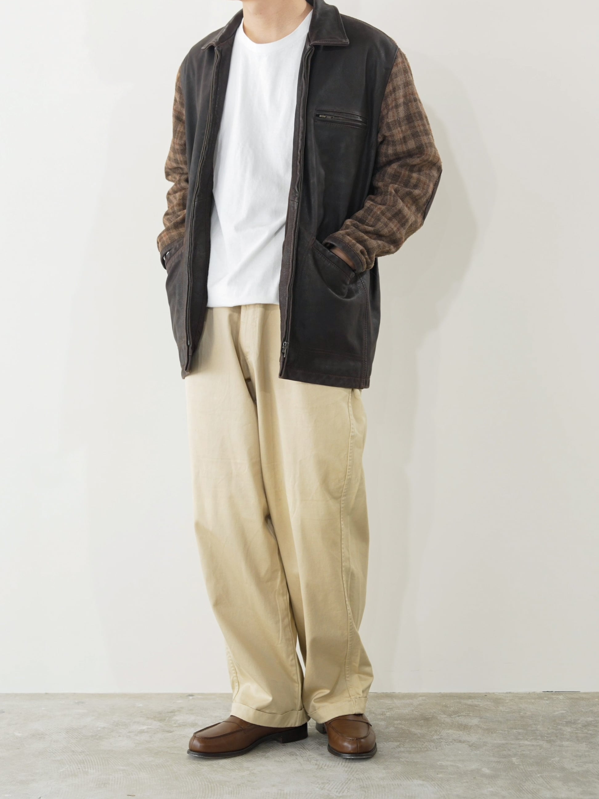 レザー × チェックウールのコンビネーション。