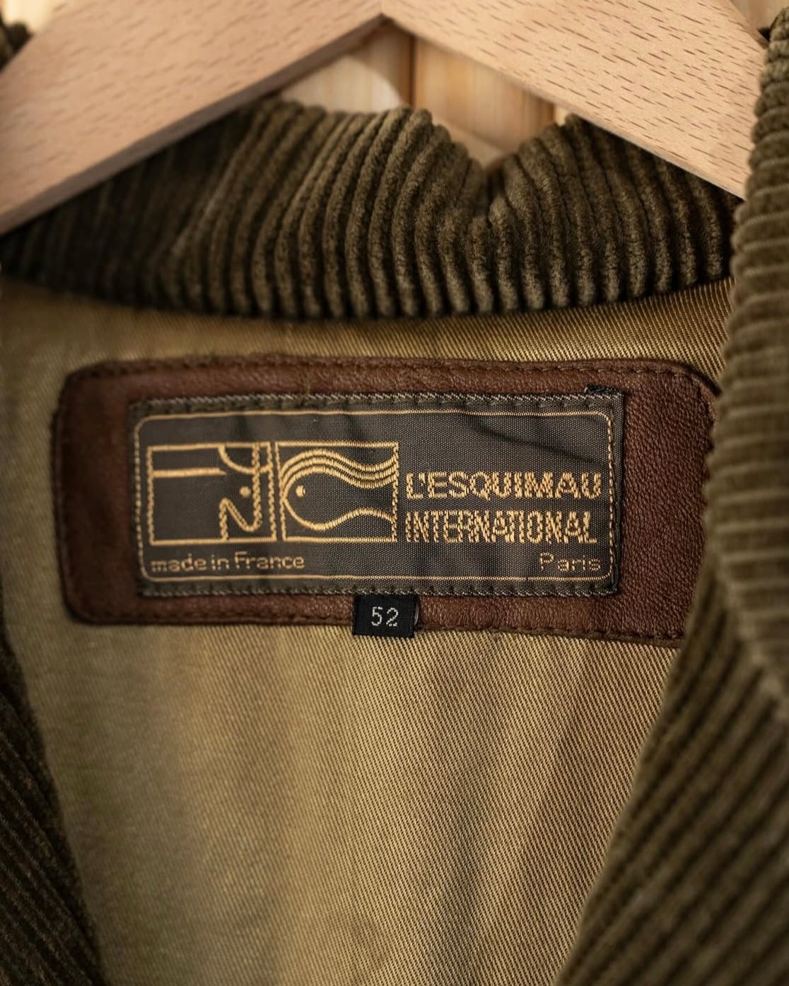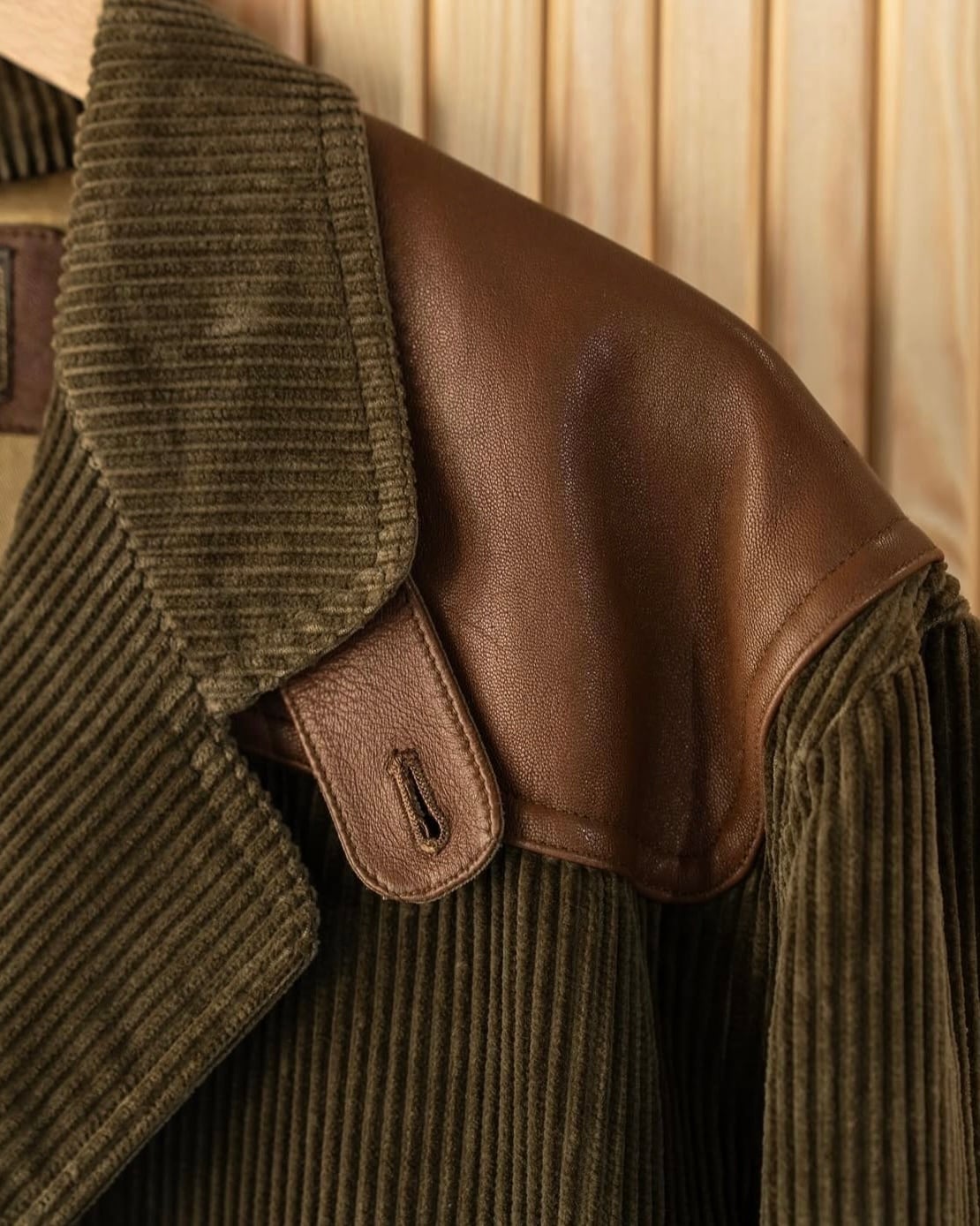 ヴィンテージらしいオリーブカラーの太畝コーデュロイ生地とブラウンレザーの切り替えが良いバランスです。