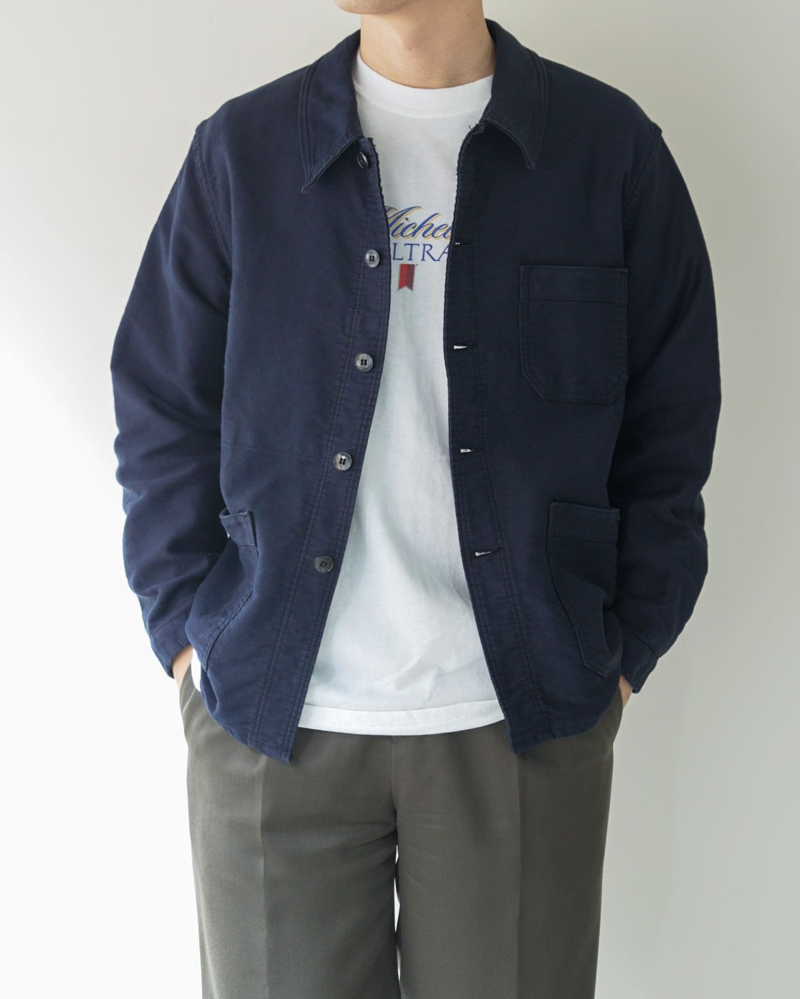 また通常のモールスキンよりも生地が薄く、まるでライトモールスキンのような質感になっており重たさを感じさせず、軽やかに羽織れるのもポイント。