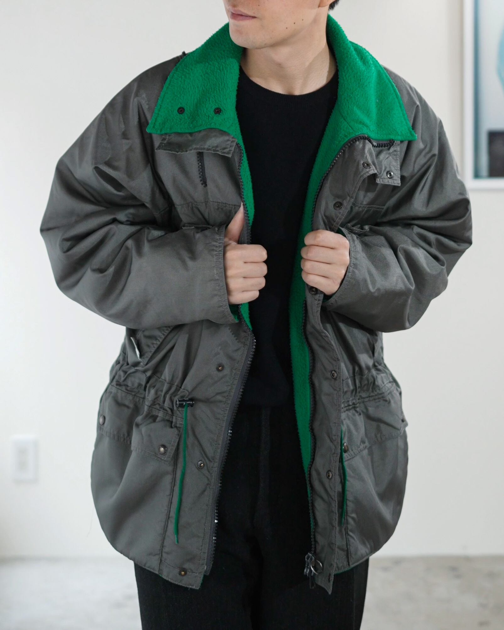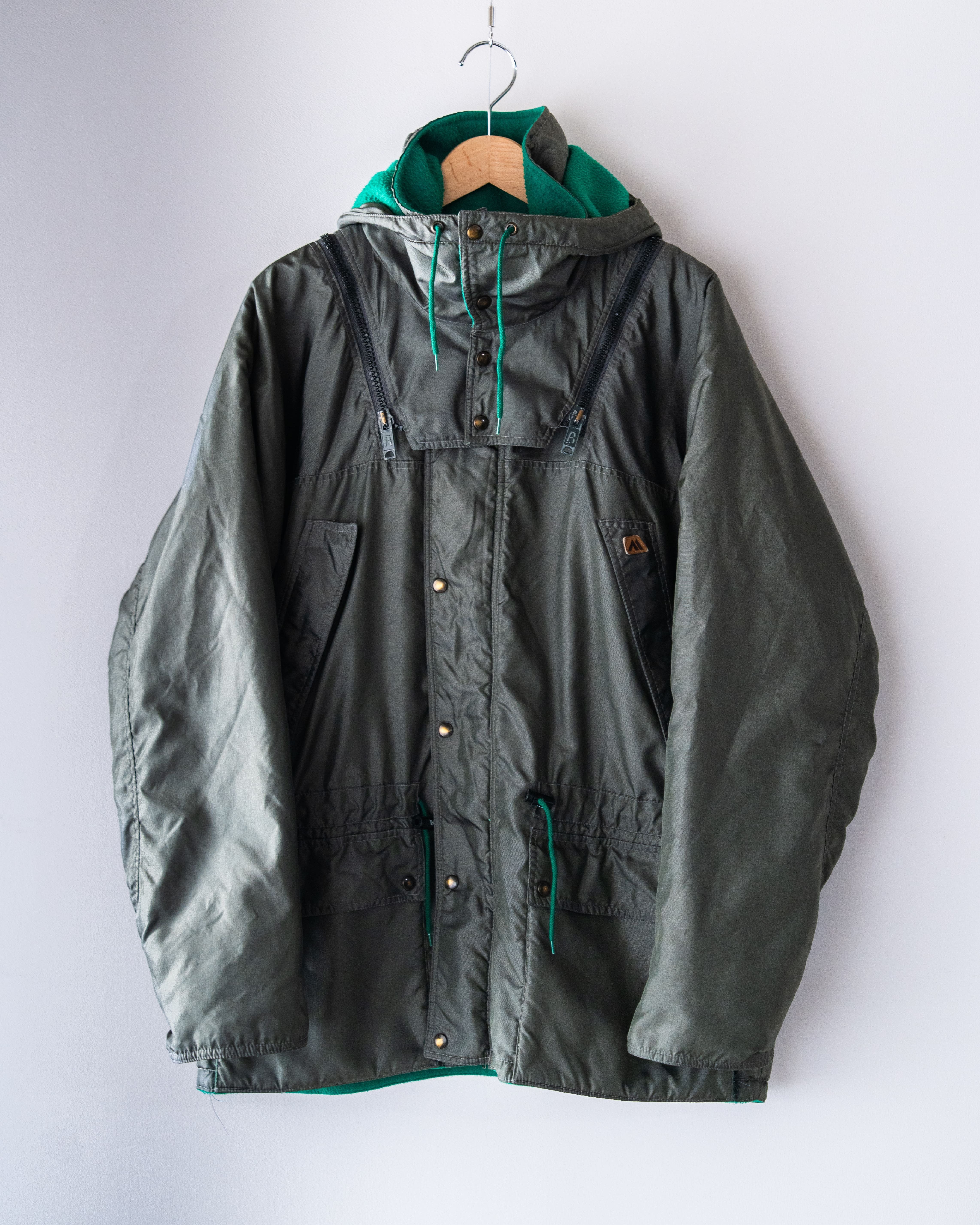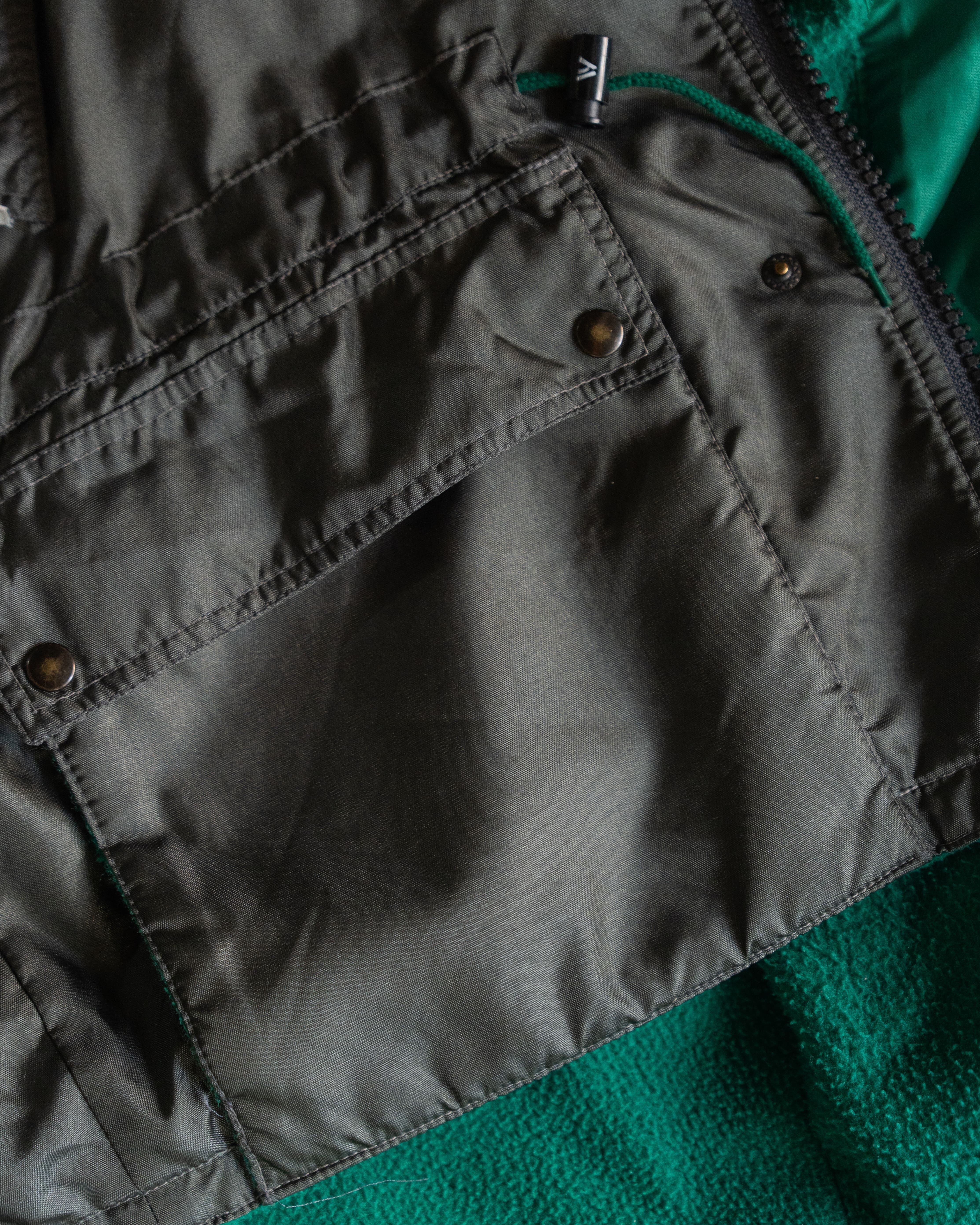ガサっとマットな質感のナイロンシェルに対して、裏地はネオングリーンの色合いが目を引くフリース素材になっています。フリースはPolartecの前身となるPolarFleece社のものを採用。袖を除く裏側全体にフリースを使っているので、非常に防寒性に優れた1着です。