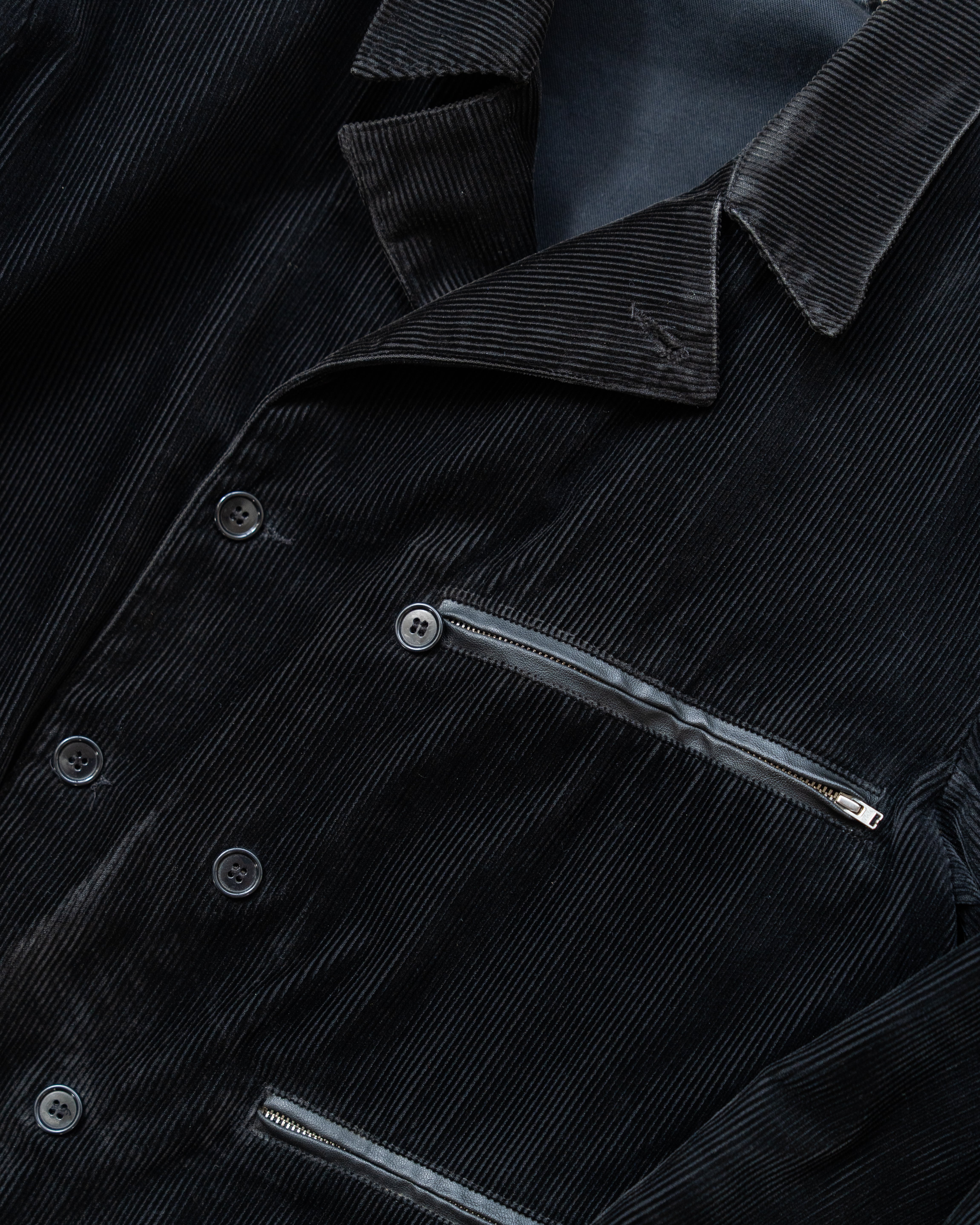 素材には細畝のブラックコーデュロイ。ワークウェアらしいタフさを持ちながら黒ならではの落ち着きがあり、細畝なことで無骨すぎない表情に仕上がっています。光の当たり方で生まれるわずかな陰影も、この素材ならでは。