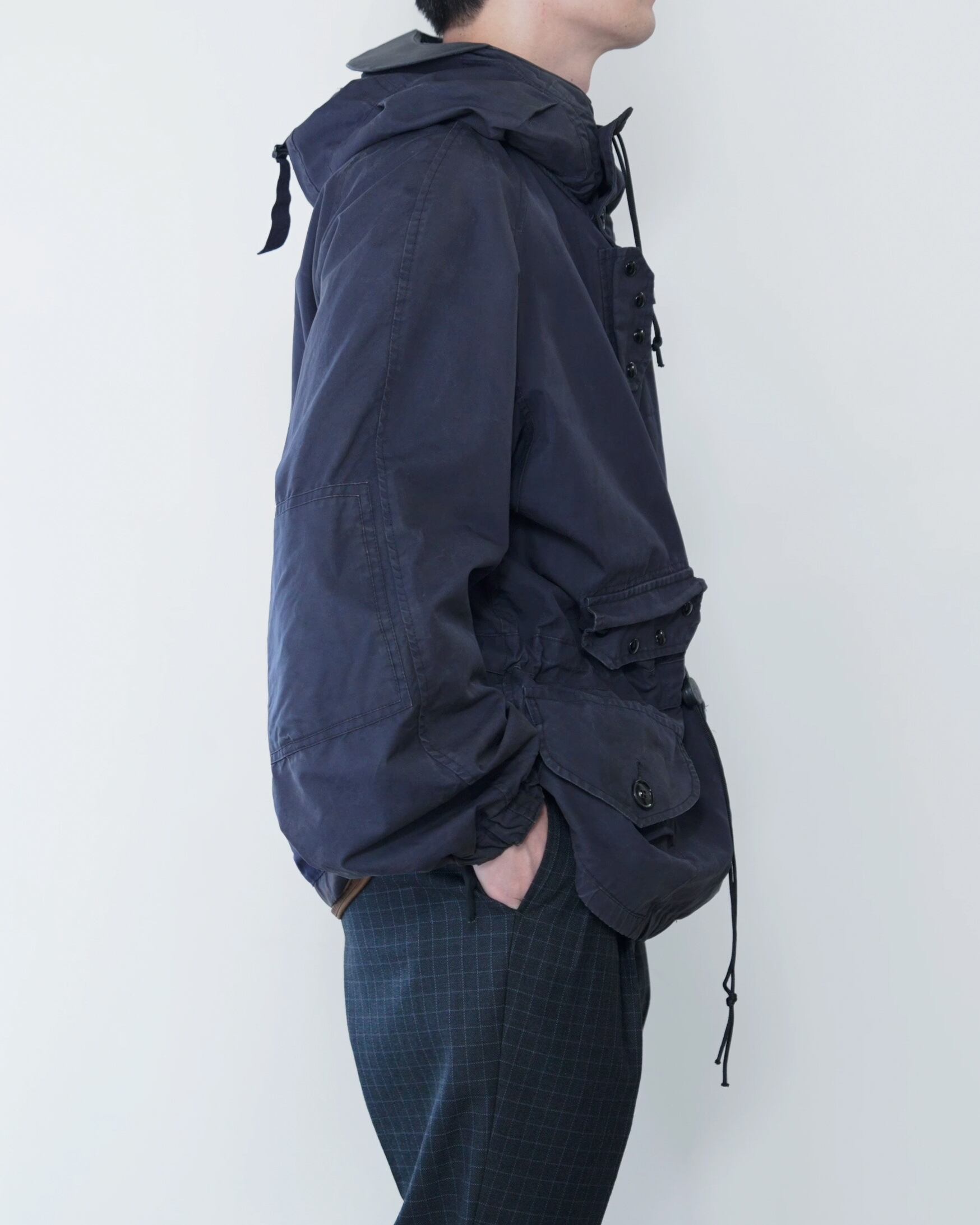 フロントにはドローコードを通すためのループやフラップ状のパーツが各所に配置されていて、本来は機能のためのディテールですが、ファッションの視点で見ると独特のリズムを生むデザインとしても面白いアクセントに。ミリタリーウェアならではの“目的のある装飾”が、現代のフィルターを通して見るとグラフィカルな印象へと導いてくれています。