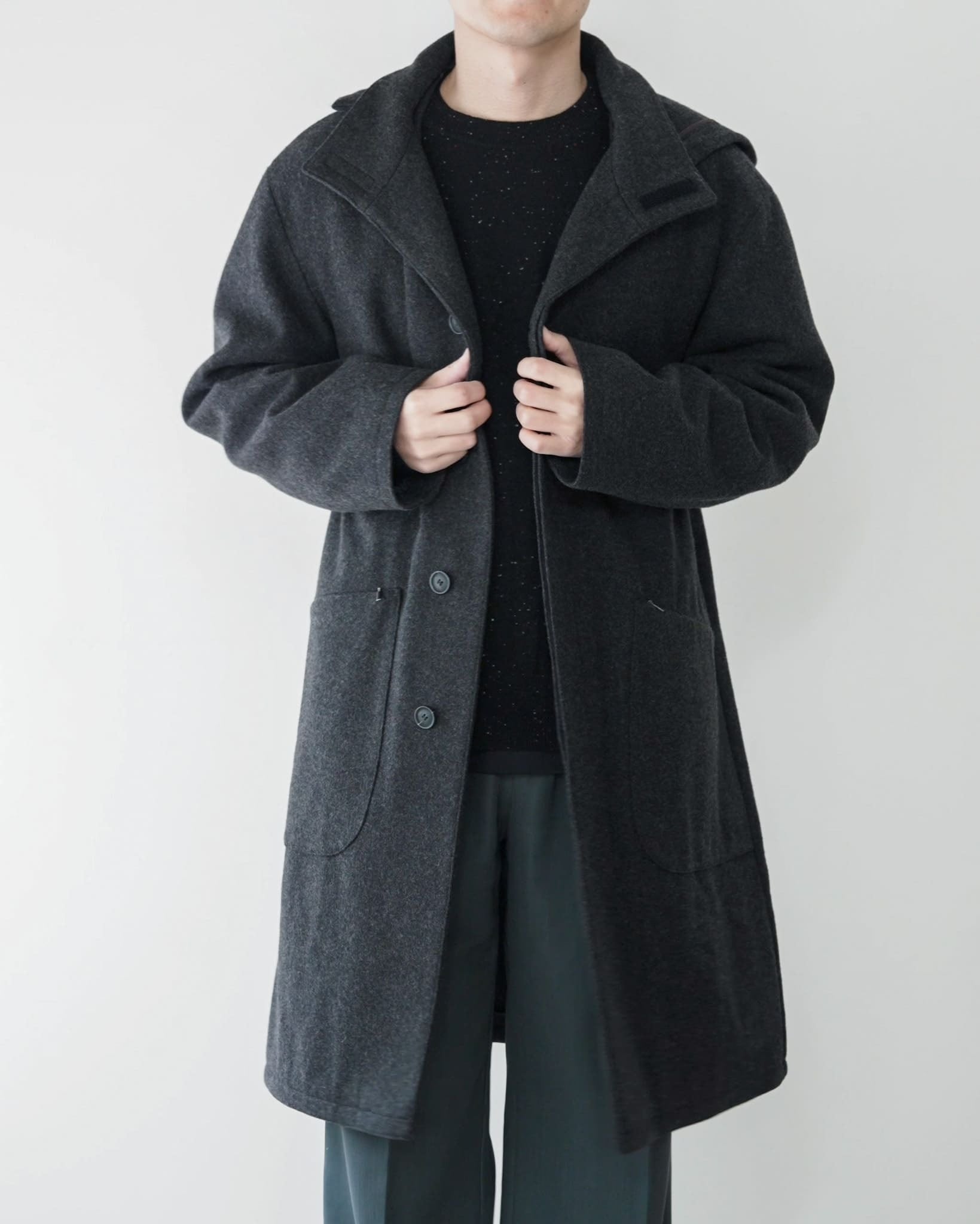 ストイックな作りに対して生地は触り心地の良いフランネルウールが採用されており、たっぷりとした分量感によるドレープが美しいです。