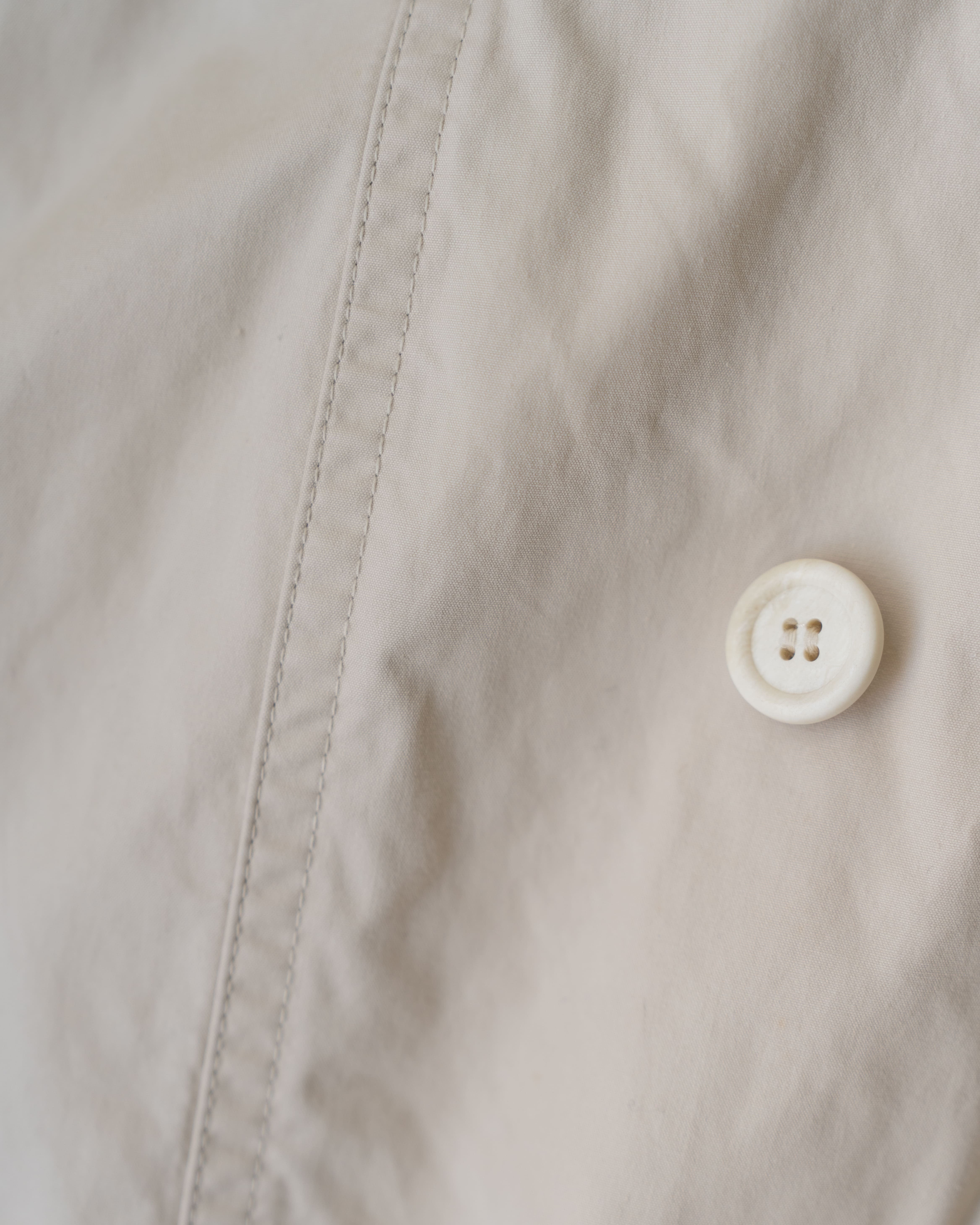 特に特徴的なのが、やや珍しいダブルブレステッド仕様。一般的な左右対称のダブルとは異なり、すべてのボタンが右前身頃側に配置された構造で、視覚的にも構造的にも強い印象を残します。実用性から導かれた仕様でありながら、結果として非常にデザイン性の高いディテールになっている点が、このブランドらしいポイントです。