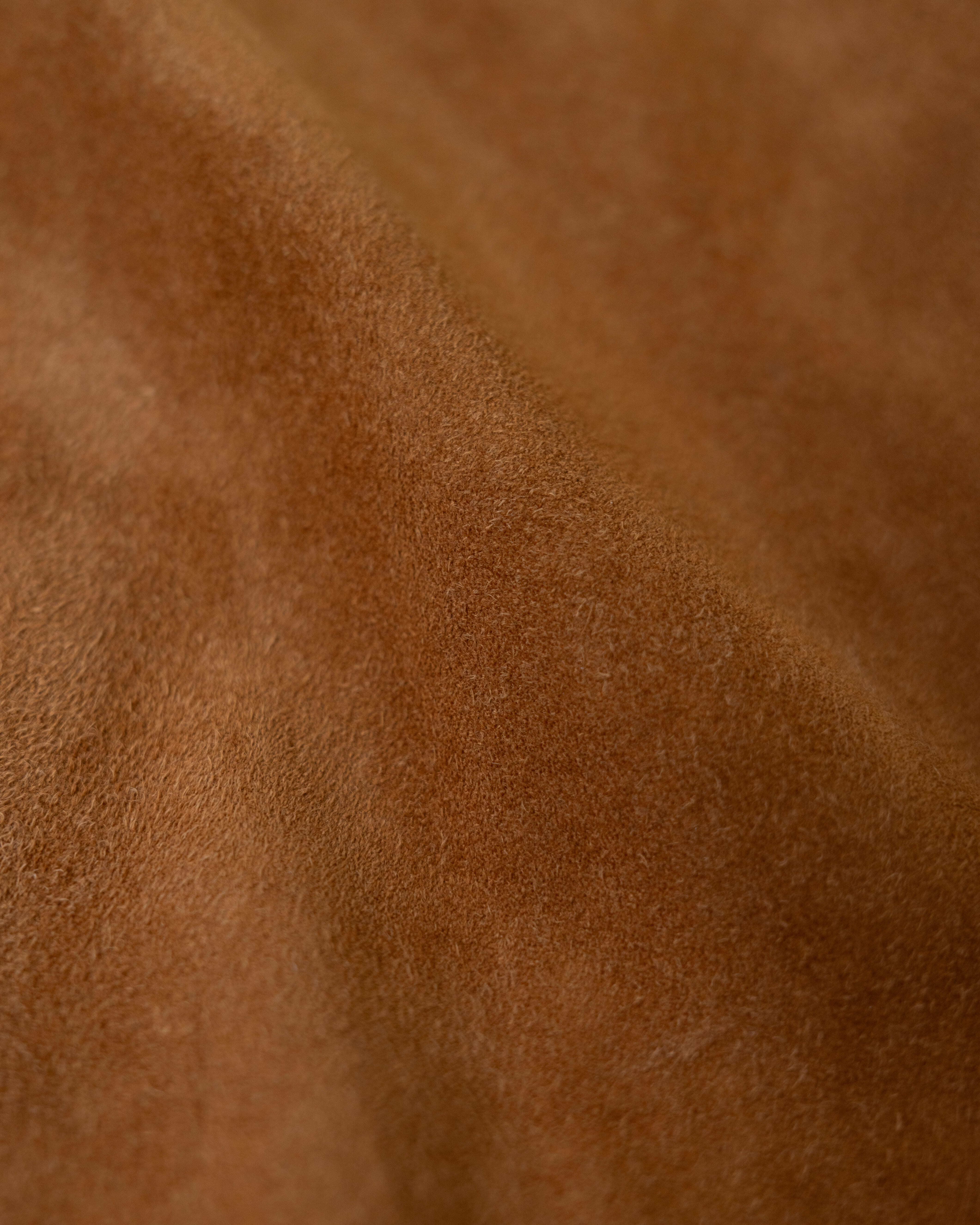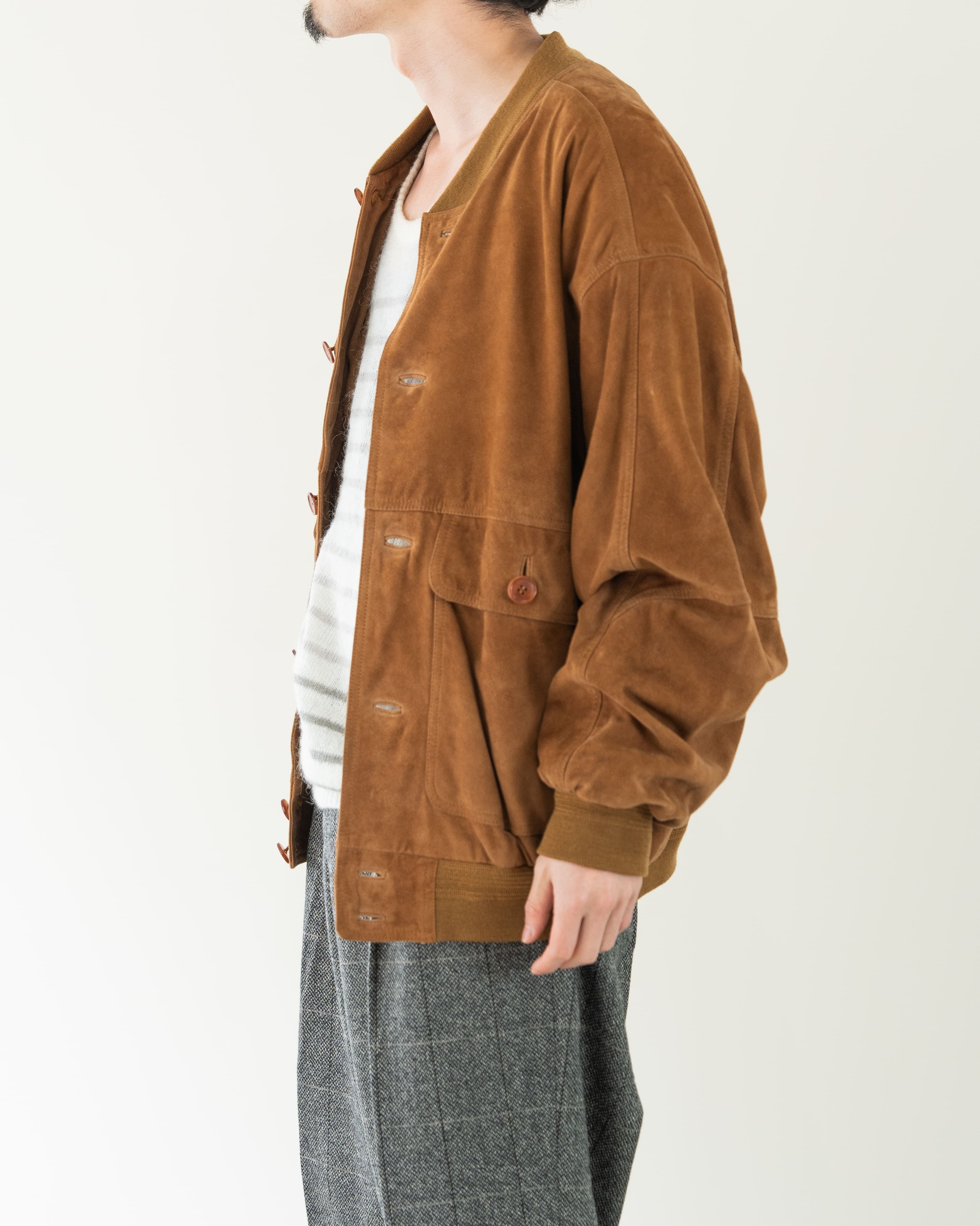 素材にはスウェードレザーを使用しており、レザー特有のハードさや野暮ったさを感じさせない柔らかな質感。しなやかで軽い着心地なので、デイリーに取り入れやすい一着です