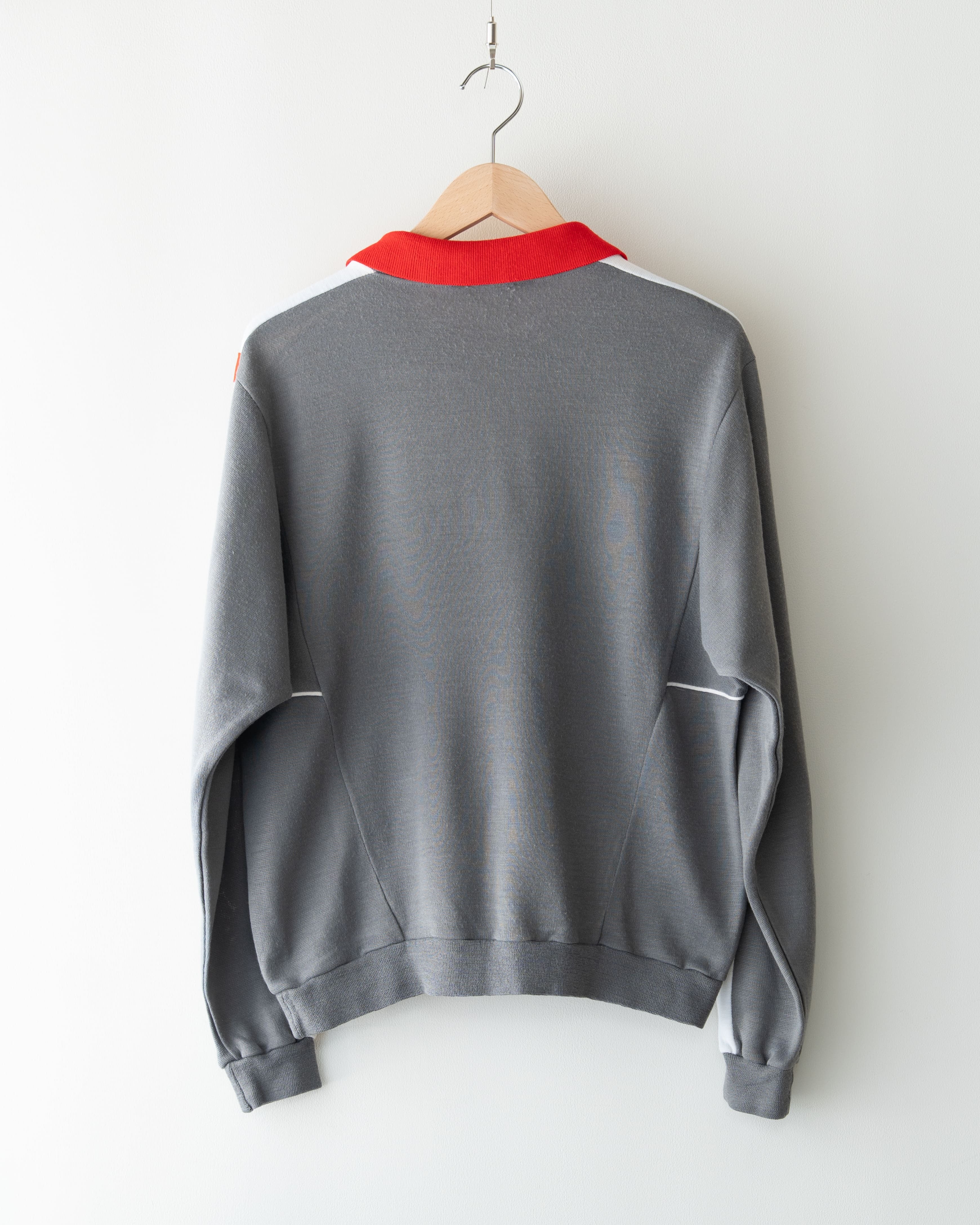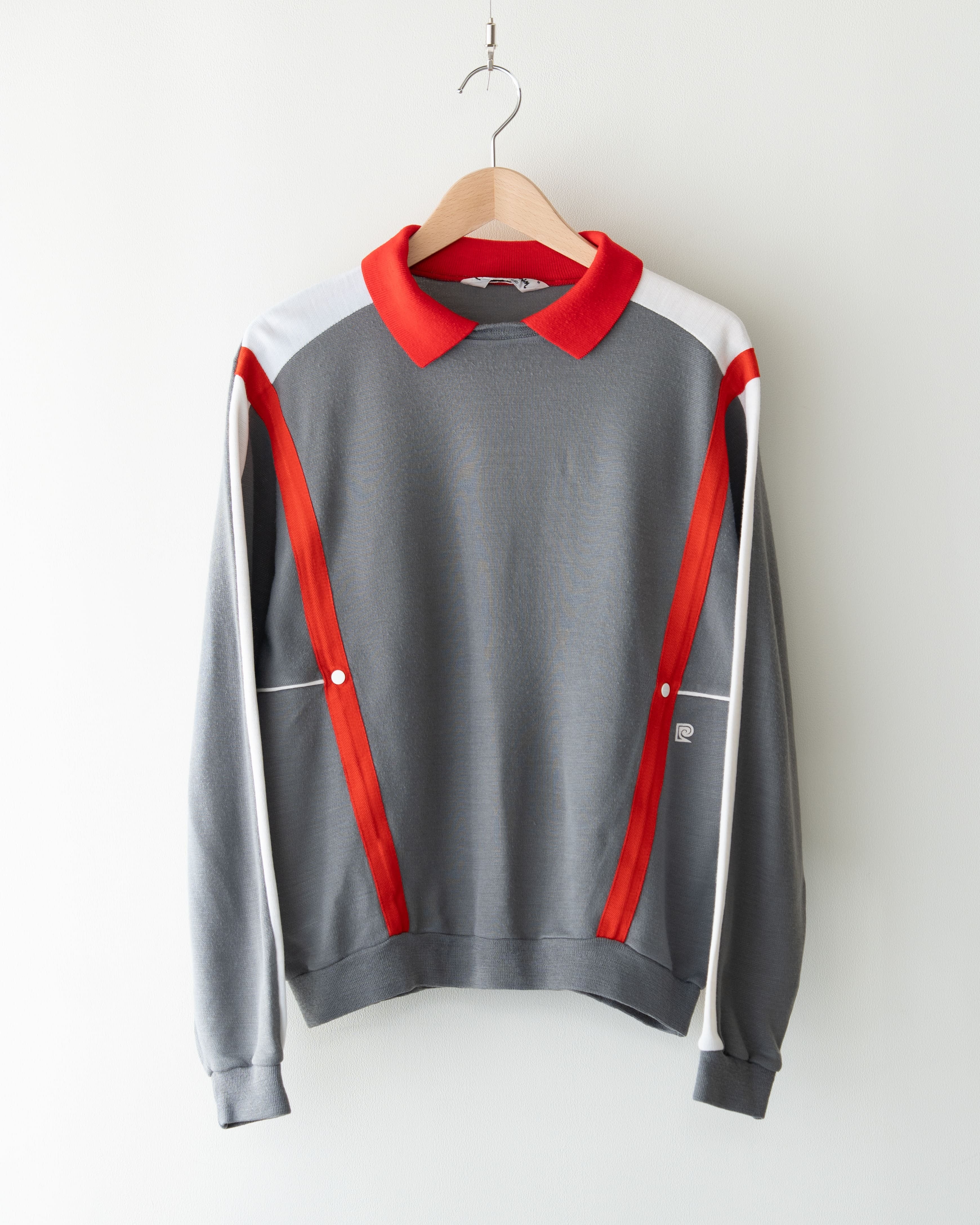グレーのボディに赤と白の切り替え、胸元にはカルダンの象徴的なロゴ。スポーツウェアの要素を取り入れながらも、どこか近未来的なムードを感じさせる一着です。