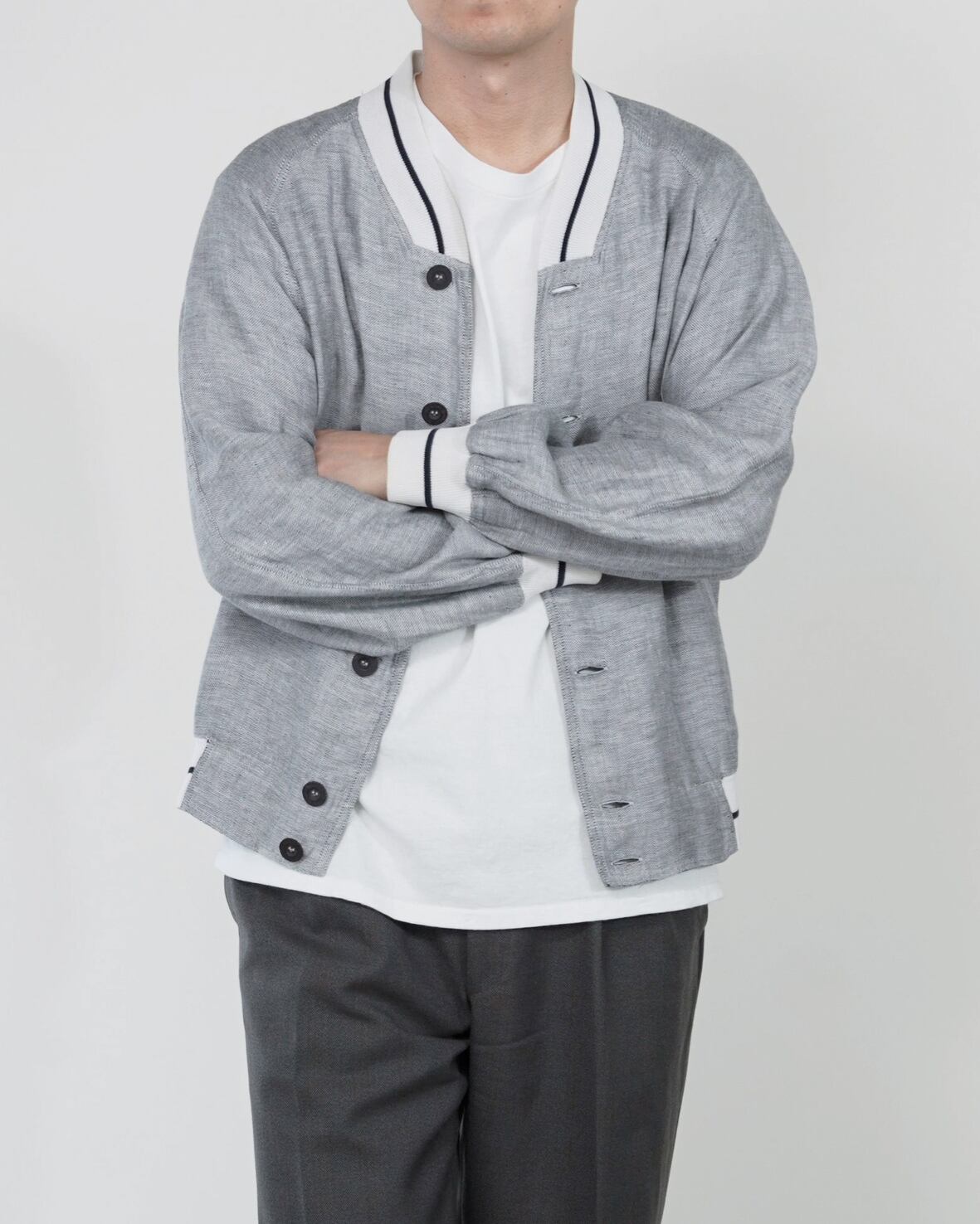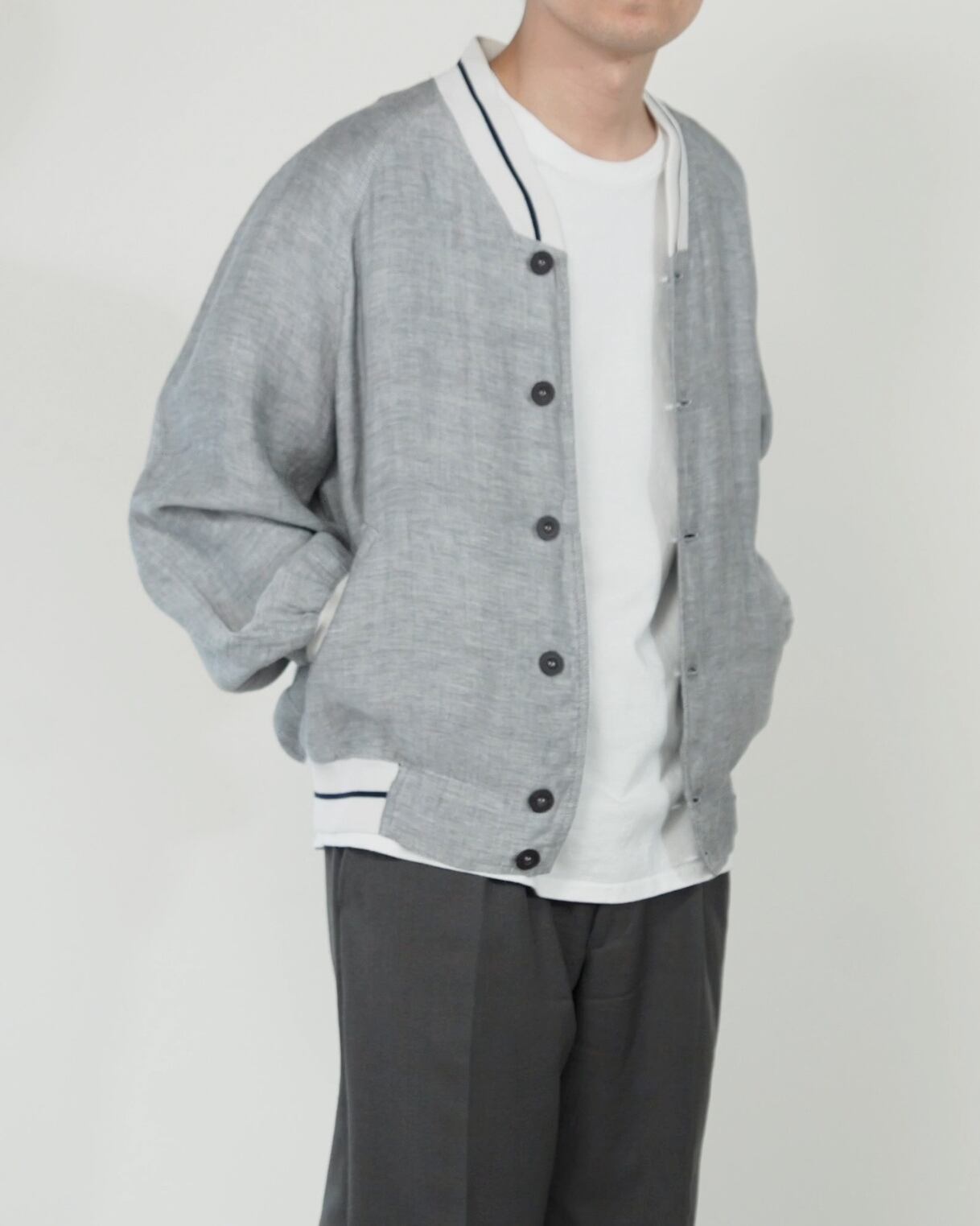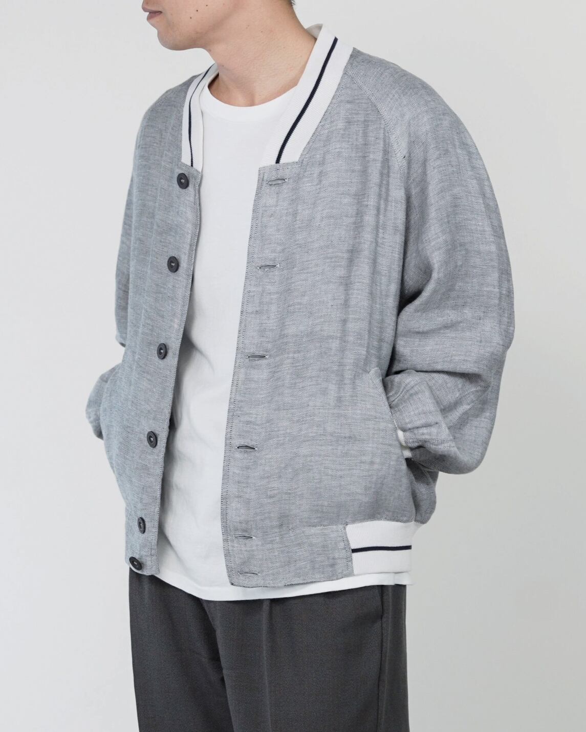 ボディには清涼感のあるリネン生地を採用しています。特有の節感があるグレーのテクスチャが、スポーティな雰囲気の中にも落ち着いた印象を与えます。