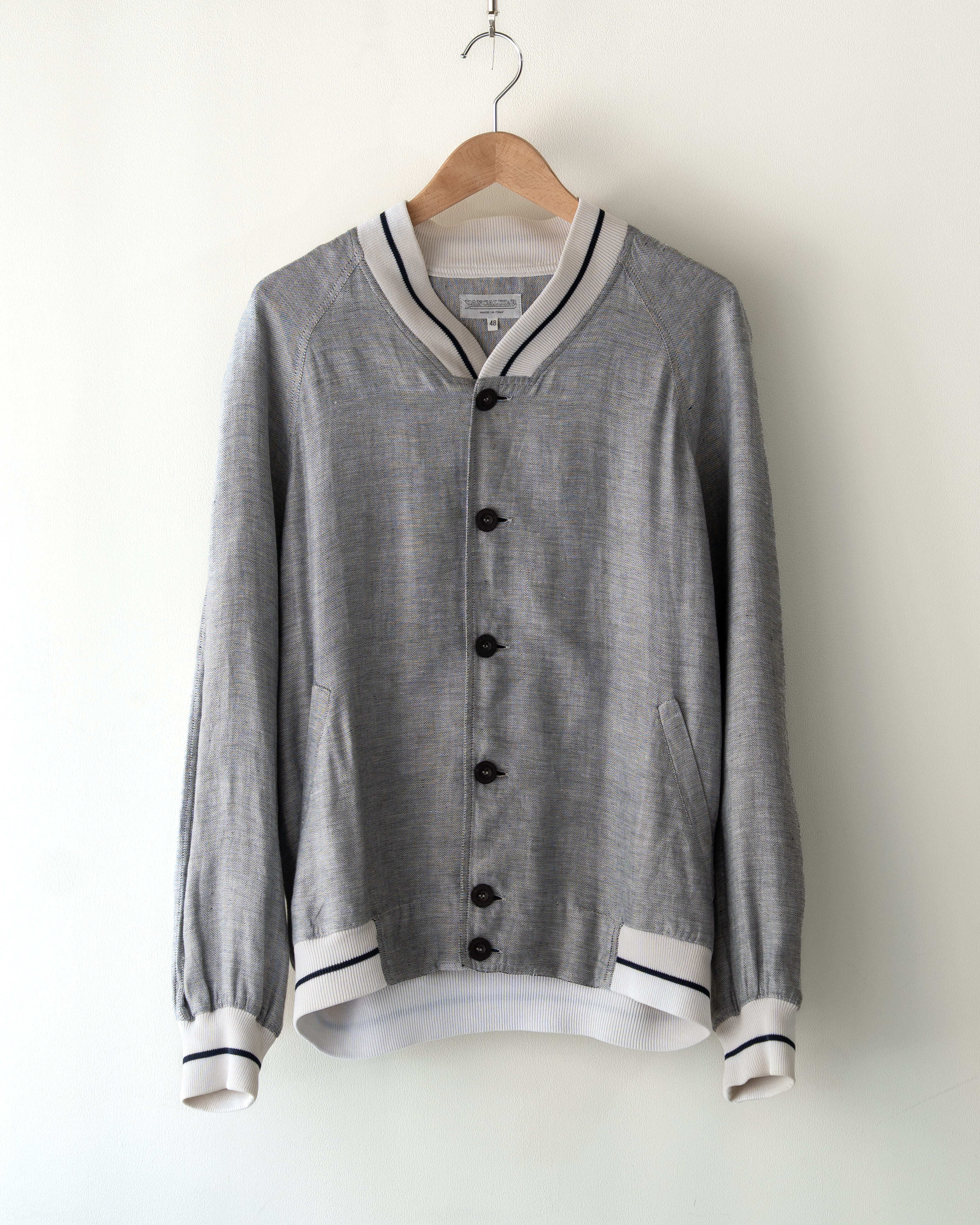イタリアのブランドPancaldi&Bによる1990年代頃のリネンジャケットです。スタジアムジャンパーのようなスポーティーな意匠をベースに、上質な素材使いによって品良く構成された一着です。